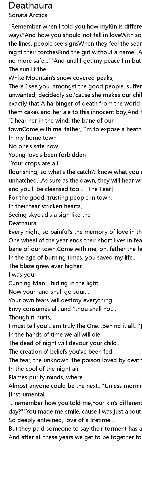 Almost anyone could be the next..."Unless morning finds all of them somehow hexed..."[Endless Inquisition][Instrumental][...Together, Today, For All Eternity]"I remember how you told me,Your kin's different, on that sunny day?""You made me smile,'cause I was just about to say the same thing..." |