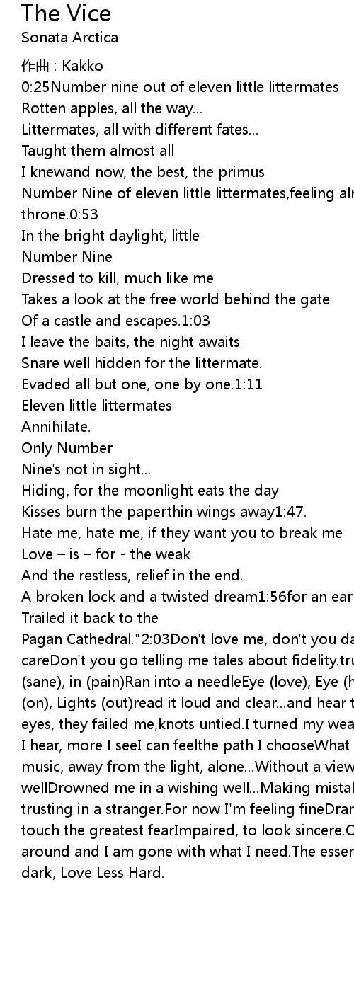 | Pagan Cathedral." 2: 03Don' t love me, don' t you dare! I lie, I cheat and I don' t careDon' t you go telling me tales about fidelity. truth ain' t safe with me2: 13In sane, in pain Ran into a needleEye love, Eye hate don' t need anyoneLights on, Lights out read it loud and clear... and hear the lion roar. without my eyes, they failed me, knots untied. I turned my weakness into afine professionmore I hear, more I seeI can feelthe path I chooseWhat I did was a must, Faced the music, away from the light, alone... Without a view. Someone thought to know me wellDrowned me in a wishing well... Making mistakes, we all do, Worst of mine was trusting in a stranger. For now I' m feeling fineDrank poison, liked the signNow touch the greatest fearImpaired, to look sincere. One step behind you, turn around and I am gone with what I need. The essense of timely death, cold and dark, Love Less Hard. |