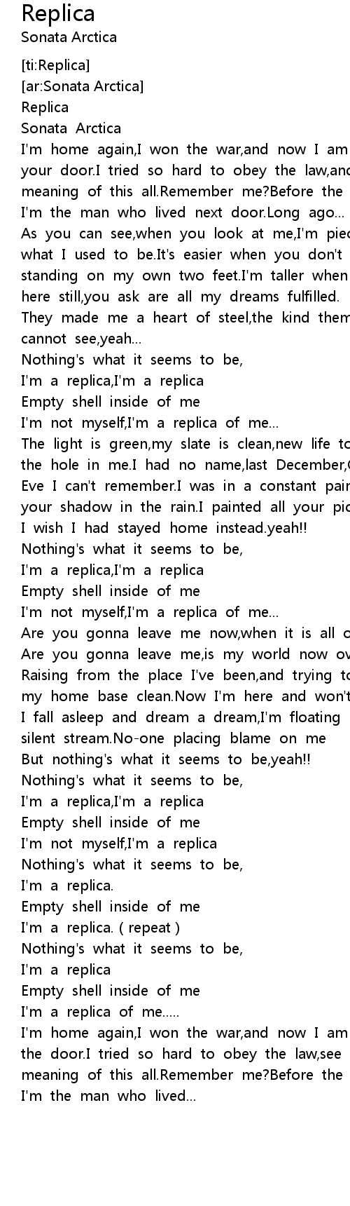 | [02:22.314] | I' m not myself, I' m a replica of me... |