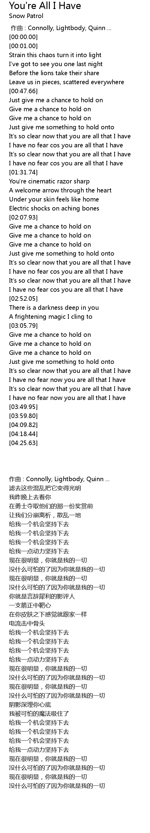 | [02:25.38] | It' s so clear now that you are all that I have |