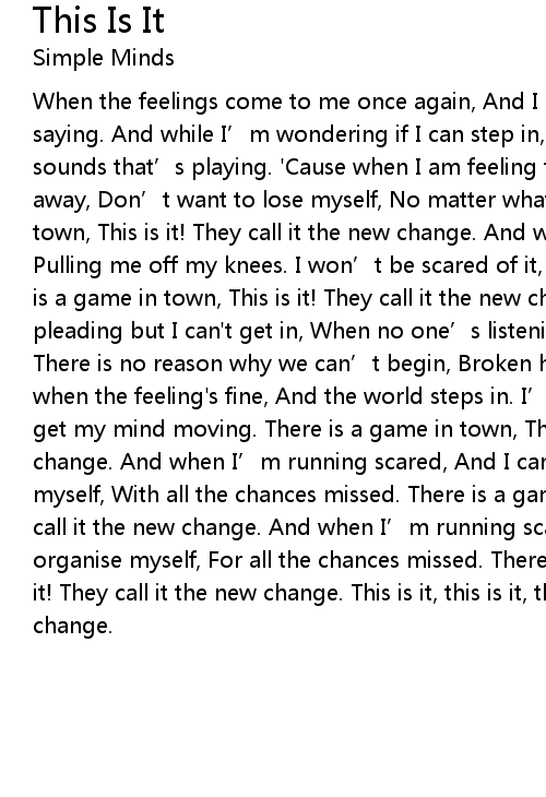 | When the feelings come to me once again, And I still hear the words they' re saying. And while I' m wondering if I can step in, I' ll take comfort in the sounds that' s playing. ' Cause when I am feeling fine, Don' t want to walk away, Don' t want to lose myself, No matter what I say. There is a game in town, This is it! They call it the new change. And when the feelings rise, Pulling me off my knees. I won' t be scared of it, ' Cause I cant believe. There is a game in town, This is it! They call it the new change. And when I' m pleading but I can' t get in, When no one' s listening to a word I am saying, There is no reason why we can' t begin, Broken hearts are congregating. ' Cause when the feeling' s fine, And the world steps in. I' ll organise myself, I' ll get my mind moving. There is a game in town, This is it! They call it the new change. And when I' m running scared, And I cant resist, I' ll organise myself, With all the chances missed. There is a game in town, This is it! They call it the new change. And when I' m running scared, And I cant resist, I' ll organise myself, For all the chances missed. There is a game in town, This is it! They call it the new change. This is it, this is it, they call it the new change. |