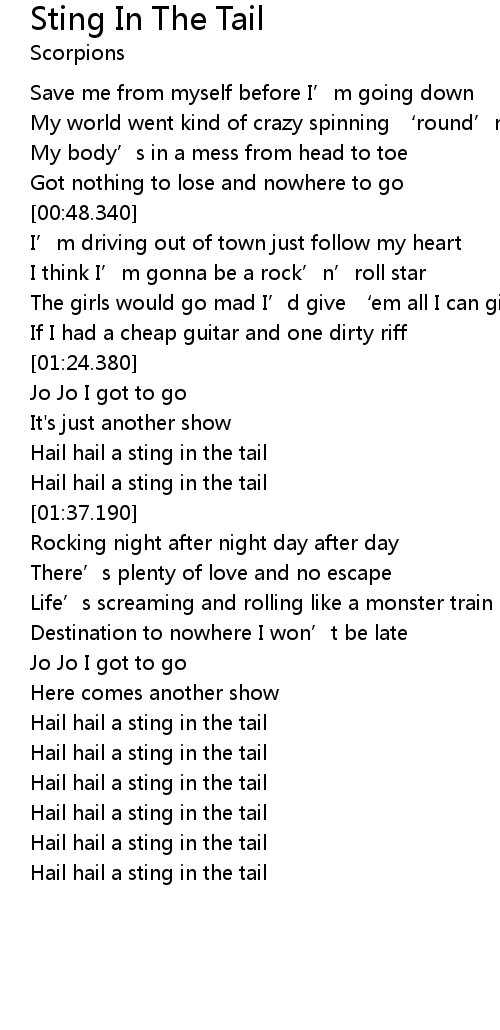 | [02:50.100] | Hail hail a sting in the tail |