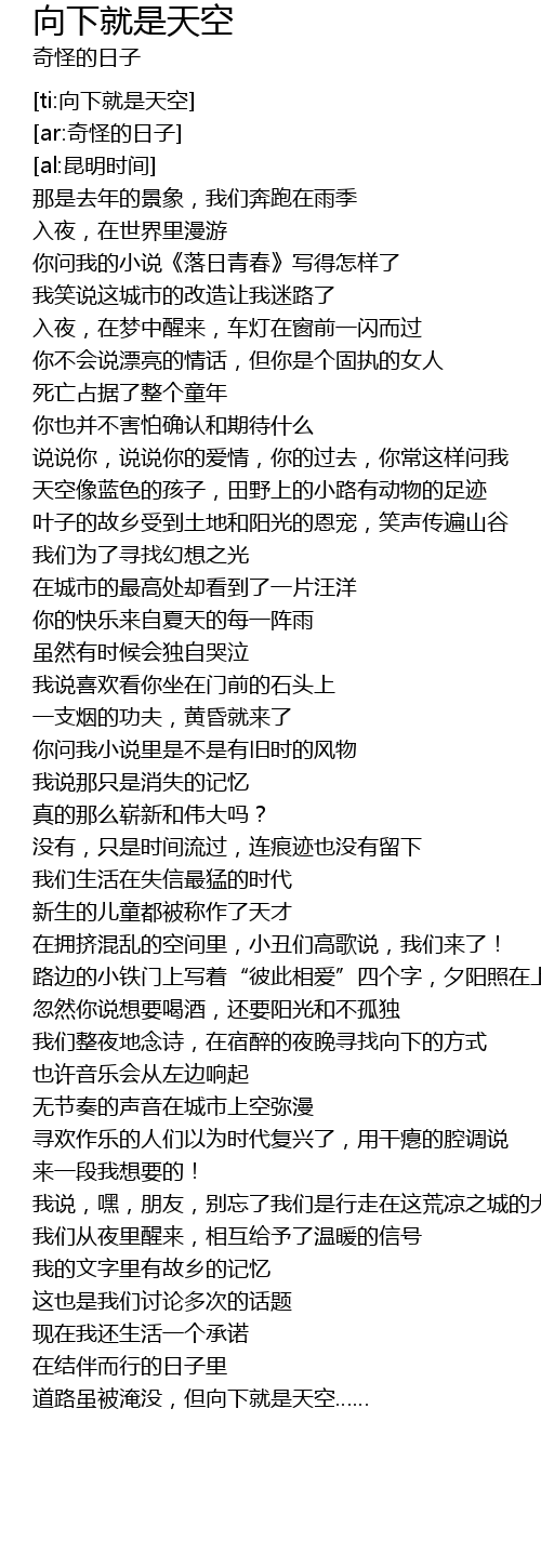 | [02:57.62] | 天空像蓝色的孩子,田野上的小路有动物的足迹 |