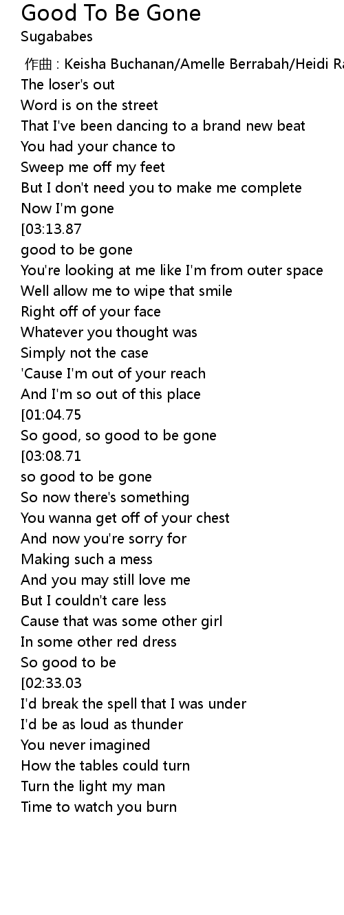 | [03:21.78][03:13.87][03:06.15][02:58.01][02:29.63][02:22.05][02:14.00][02:06.24][01:56.43][01:25.53][01:18.08][00:42.80] | So good to be gone |