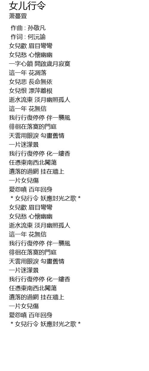 | [03:27.480] | 女兒愁 心懷幽幽 |