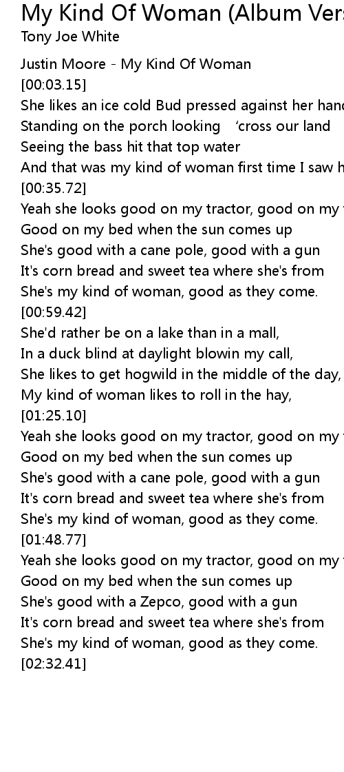 | [00:53.19] | She's my kind of woman, good as they come. |