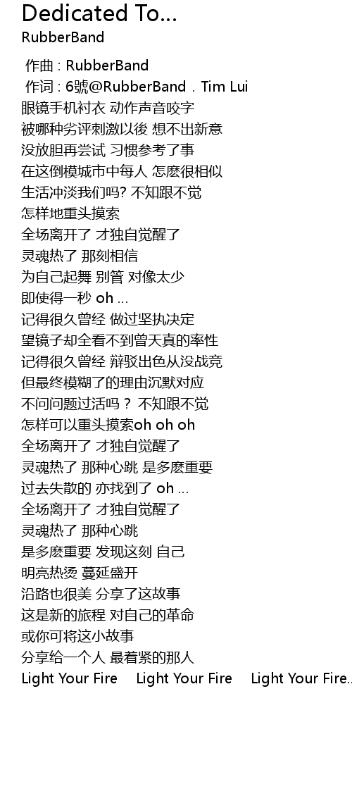 | [00:01.00] | 作词 : 6號@RubberBand.Tim Lui |