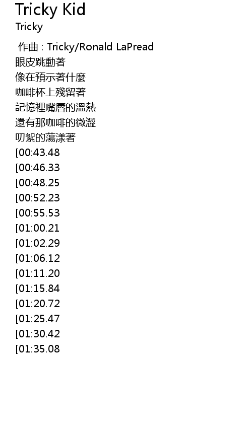 | [00:00.00] | 作曲 : Tricky/Ronald LaPread |