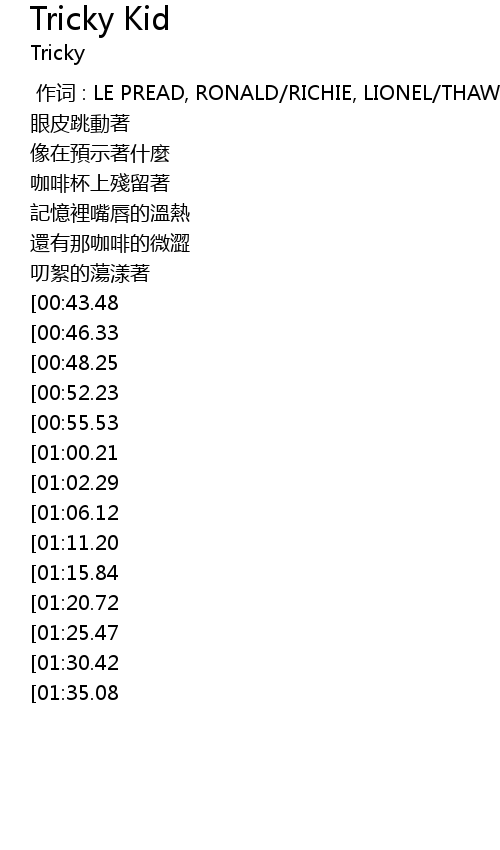| [00:00.00] | 作词 : LE PREAD, RONALD/RICHIE, LIONEL/THAW, ANDREW |