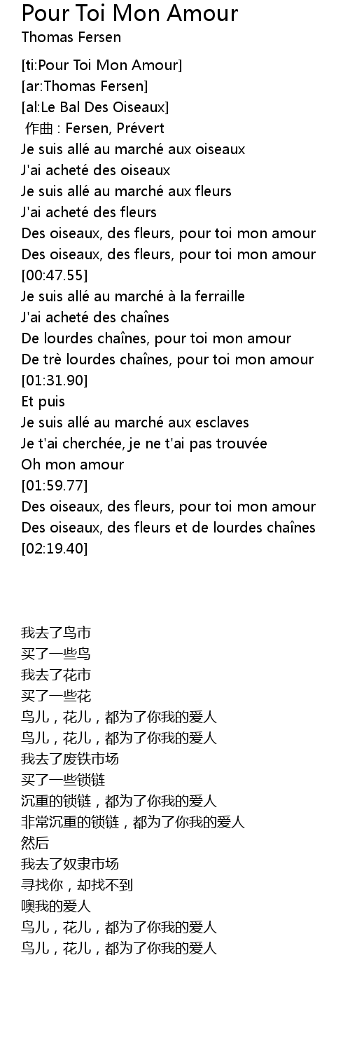 | [02:02.73] | Des oiseaux, des fleurs, pour toi mon amour |