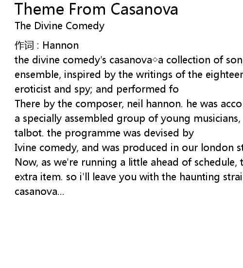 | the divine comedy' s casanova a collection of songs for bass baritone and ensemble, inspired by the writings of the eighteenth century venetian gambler, eroticist and spy and performed fo | |