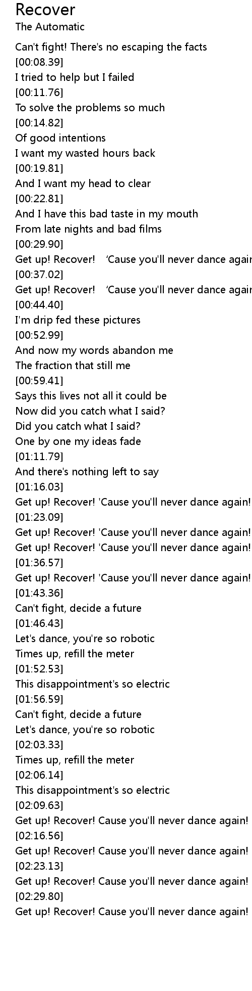 | [02:23.94] | Get up! Recover! Cause you'll never dance again! |