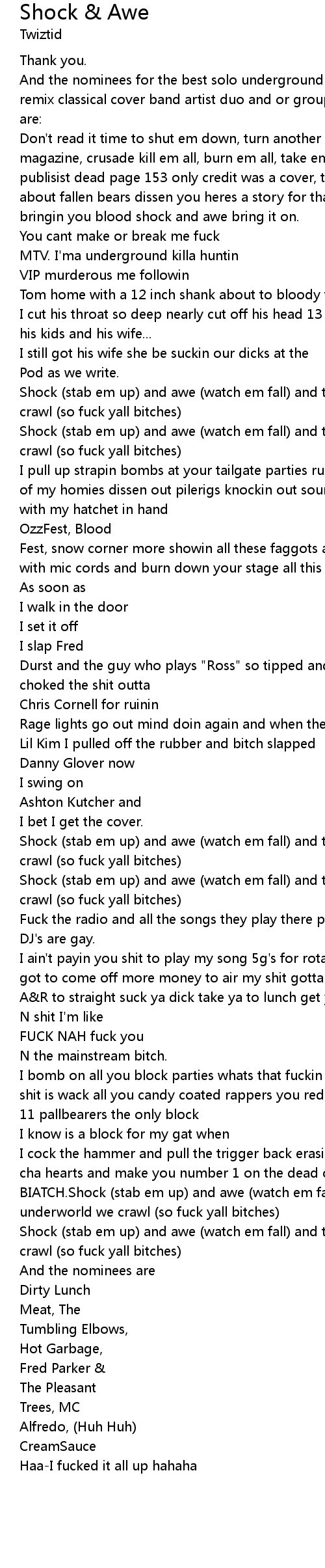 BIATCH.Shock (stab em up) and awe (watch em fall) and then back into the underworld we crawl (so fuck yall bitches) |