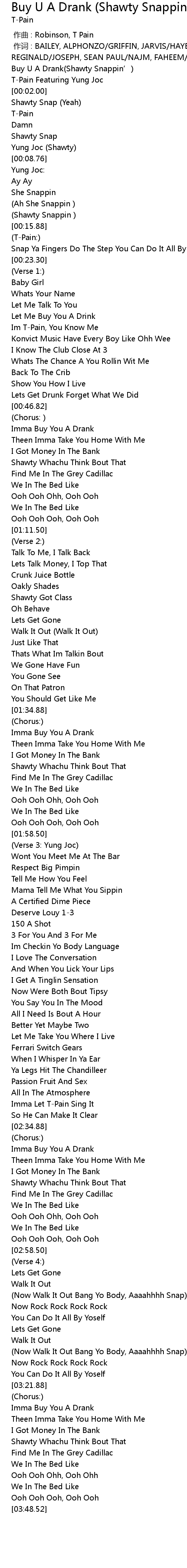 | [00:01.00] | Buy U A Drank(Shawty Snappin’) |