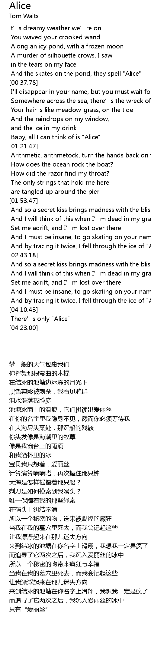 | [00:29.53] | And the skates on the pond, they spell "Alice" |