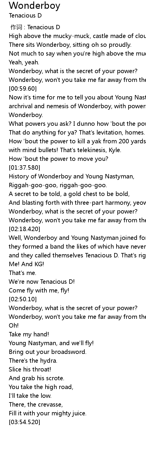 | [00:39.510] | Wonderboy, what is the secret of your power? |