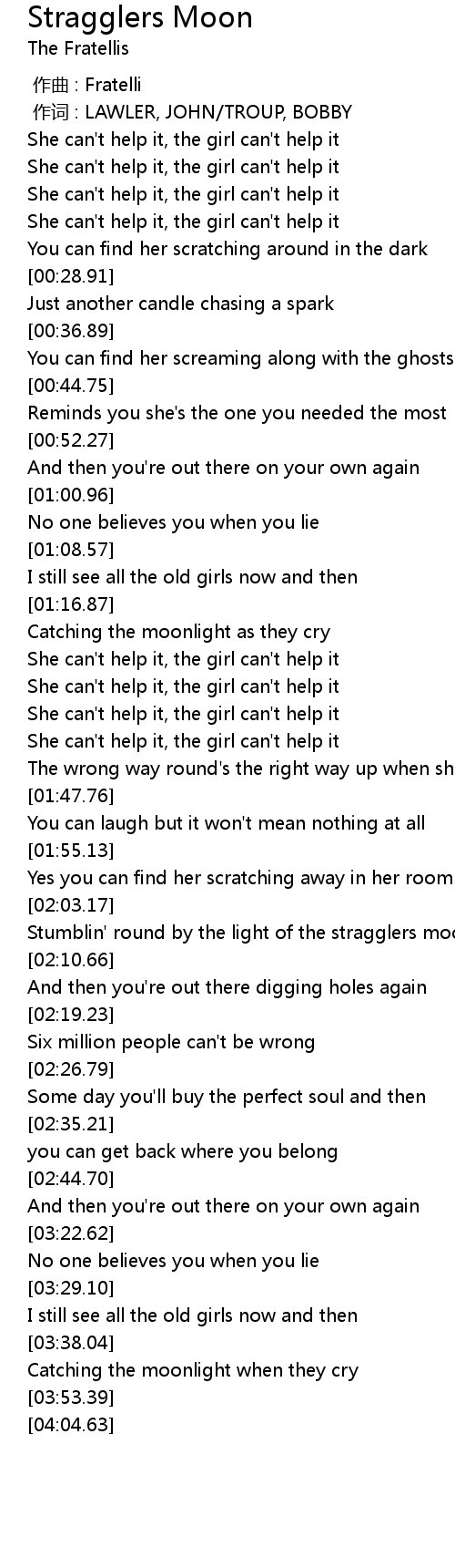 | [02:05.93] | Stumblin' round by the light of the stragglers moon |
