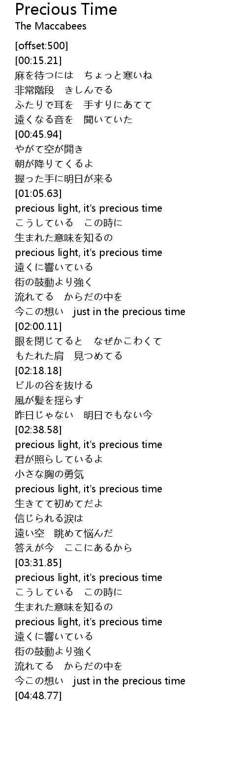| [01:08.15] | precious light, it's precious time |