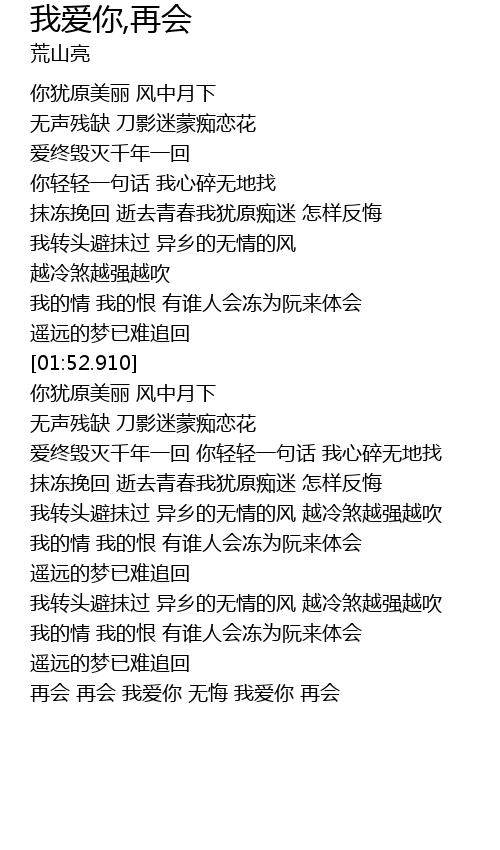 | [04:22.790] | 再会 再会 我爱你 无悔 我爱你 再会 |