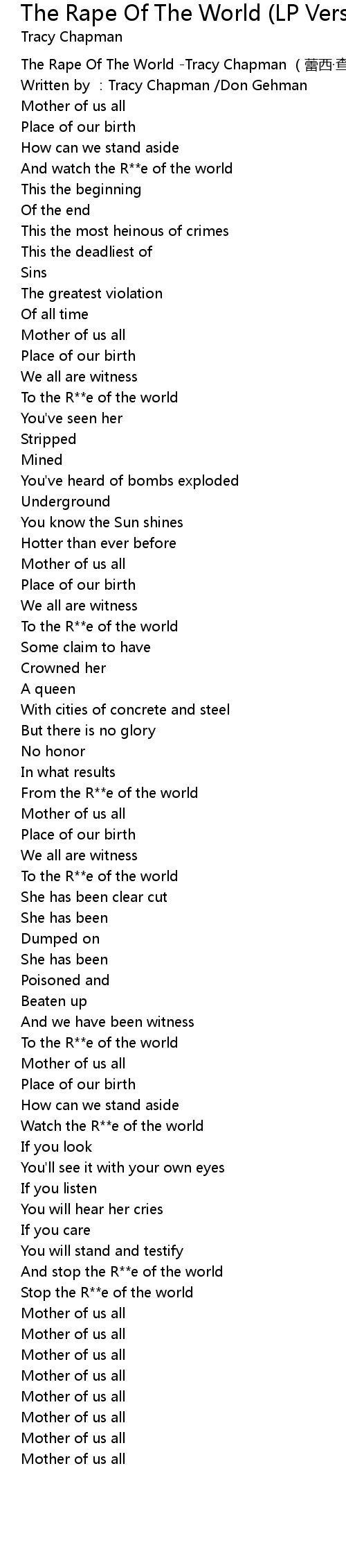 | [00:00.00] | The Rape Of The World -Tracy Chapman (蕾西·查普曼) |