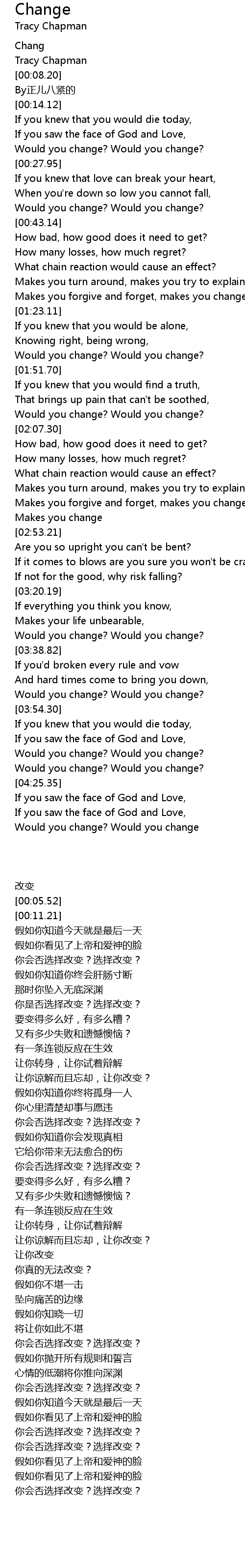 | [00:05.52] | Tracy Chapman |