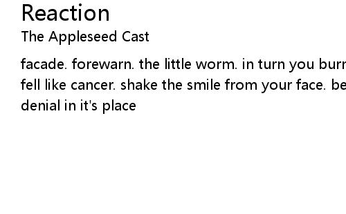 | facade. forewarn. the little worm. in turn you burn out the secret places. i fell like cancer. shake the smile from your face. be still and answer. put denial in it's place |