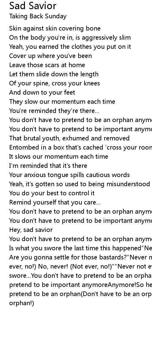 Are you gonna settle for those bastards?"Never not ever again!""Never! (Not ever, no!) No, never! (Not ever, no!)""Never not ever again!'Is what you swore...You don't have to pretend to be an orphan anymoreYou don't have to pretend to be important anymoreAnymore!So hey, sad saviorYou don't have to pretend to be an orphan(Don't have to be an orphan!)Not an orphan anymore(Not an orphan!) |