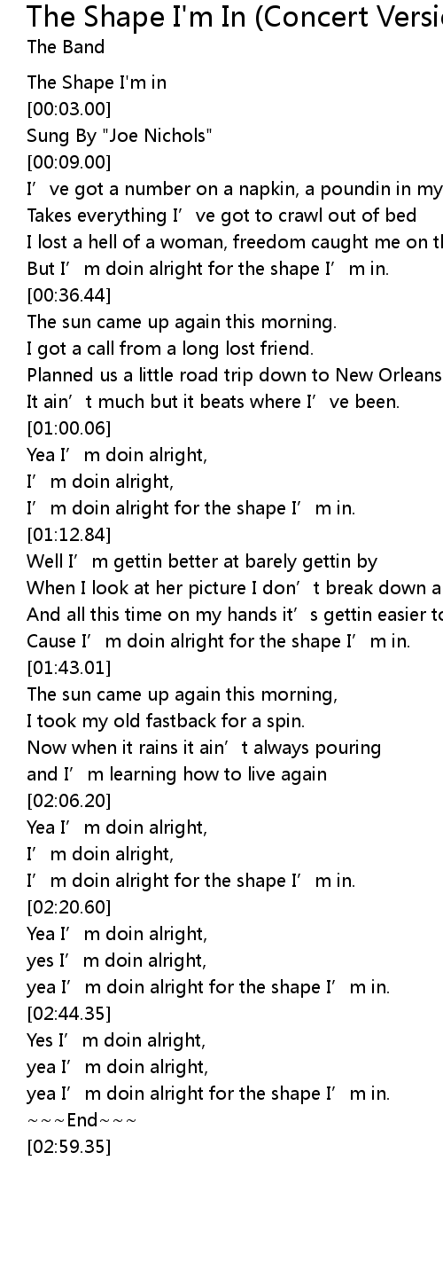 | [00:31.28] | But I' m doin alright for the shape I' m in. |