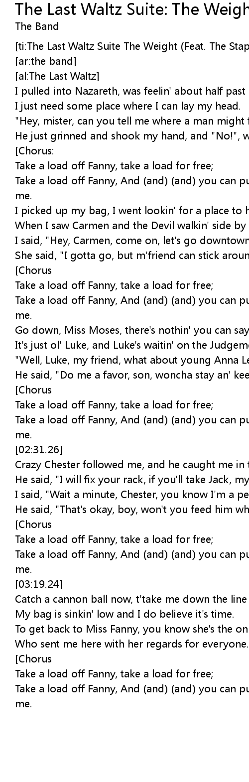 [ti:The Last Waltz Suite The Weight (Feat. The Staples)] |