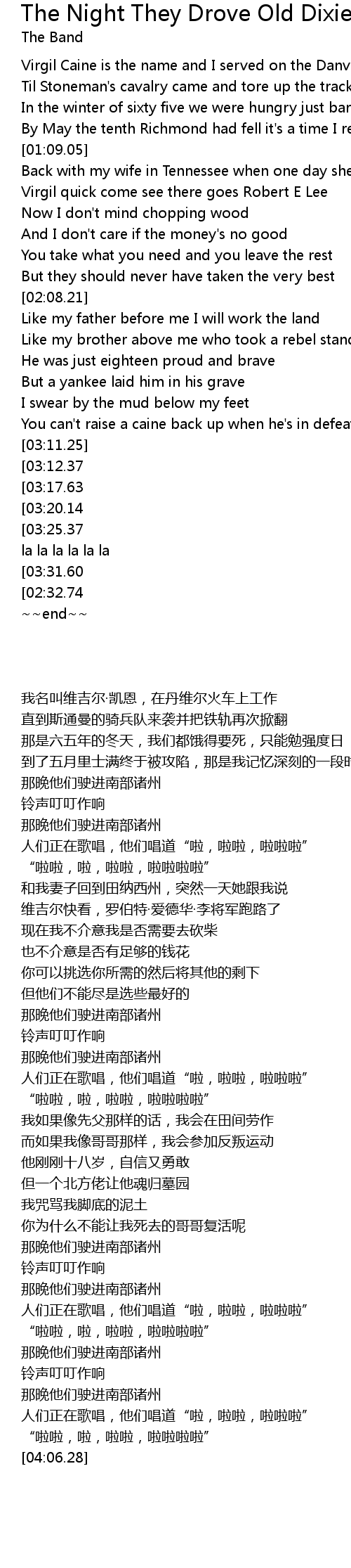 | [03:50.82][03:20.14][02:17.45][01:18.27] | The night they drove old Dixie down |