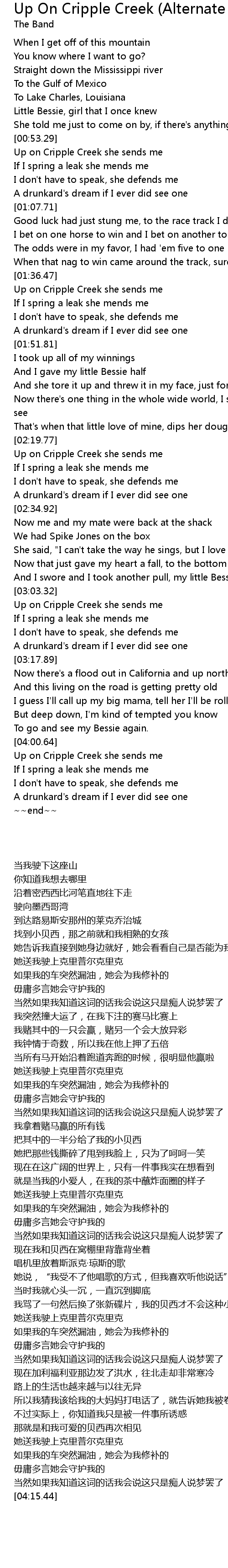 | [01:37.90] | Up on Cripple Creek she sends me |