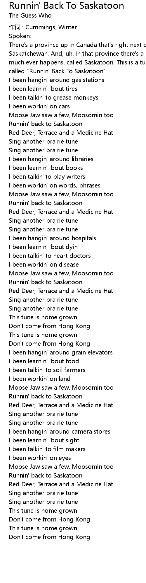 | There' s a province up in Canada that' s right next door to ours. It' s called Saskatchewan. And, uh, in that province there' s a small town, uh, where nothing much ever happens, called Saskatoon. This is a tune about that town. This is called " Runnin' Back To Saskatoon". | |