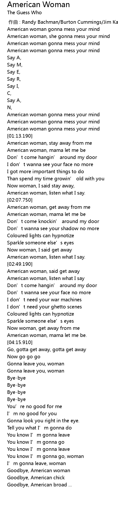 | [00:00.00] | 作曲 : Randy Bachman/Burton Cummings/Jim Kale/Garry Peterson |