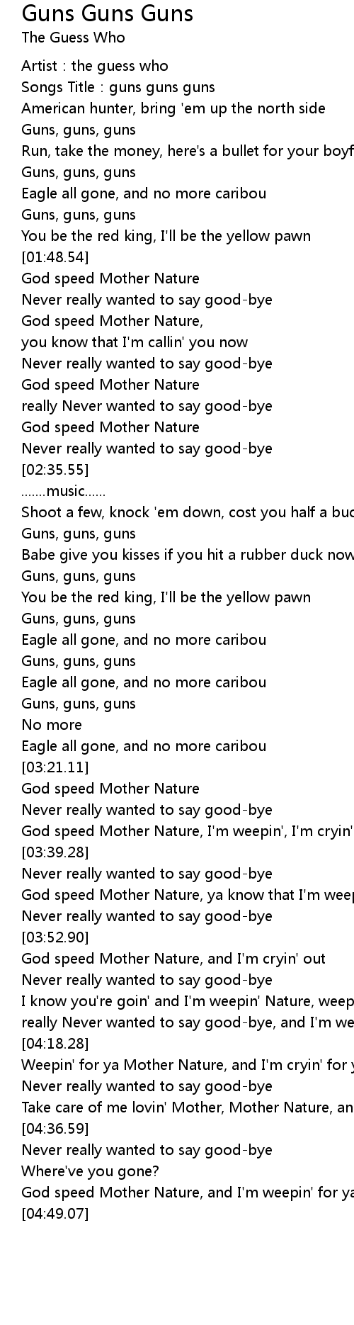 | [03:34.27] | God speed Mother Nature, I' m weepin', I' m cryin' for ya |