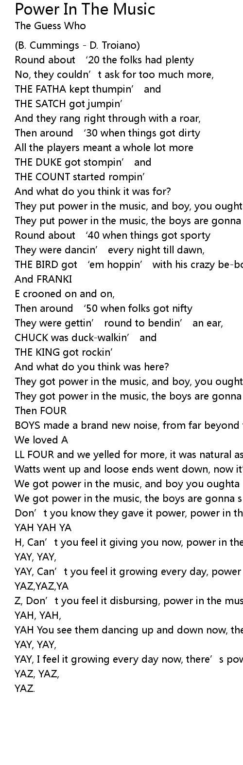 | Z, Don' t you feel it disbursing, power in the music, | |