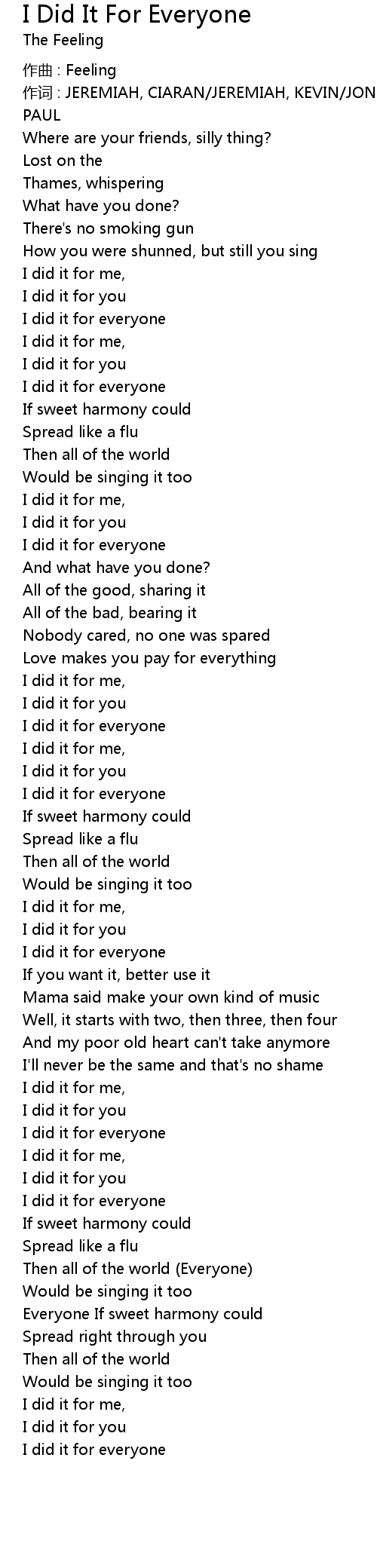 | 作词 : JEREMIAH, CIARAN/JEREMIAH, KEVIN/JONES, RICHARD/SELLS, DANIEL/STEWART, PAUL | |