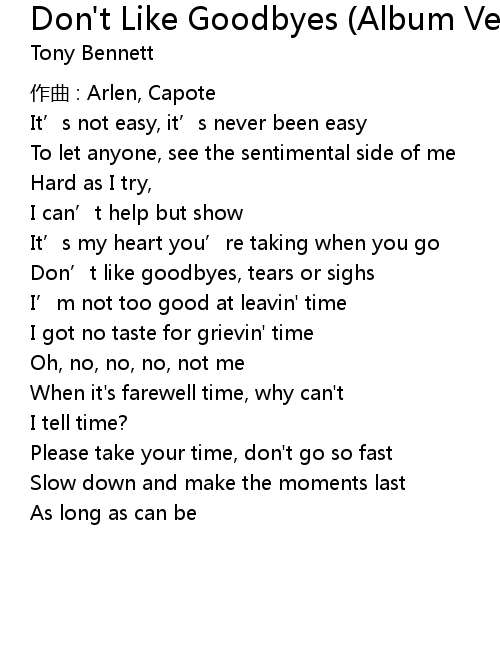 | Don' t like goodbyes, tears or sighs | |