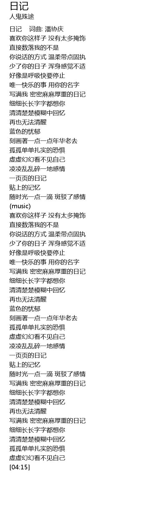 | [03:32] | 写满我 密密麻麻厚重的日记 |