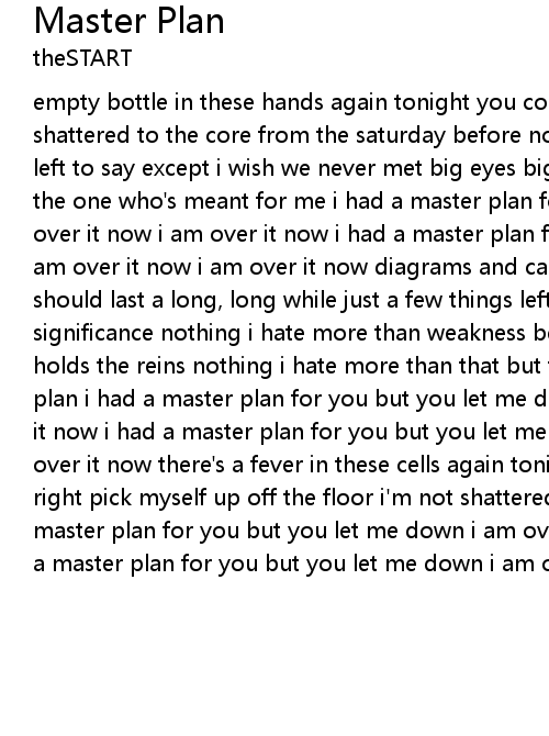 | empty bottle in these hands again tonight you could never get it right i am shattered to the core from the saturday before now to big for there is nothing left to say except i wish we never met big eyes big enough to see you were not the one who's meant for me i had a master plan for you but you let me down i am over it now i am over it now i had a master plan for you but you let me down i am over it now i am over it now diagrams and calculations had been made this should last a long, long while just a few things left to chance nothing of significance nothing i hate more than weakness being feigned by the girl who holds the reins nothing i hate more than that but the man who foiled my master plan i had a master plan for you but you let me down i am over it now i am over it now i had a master plan for you but you let me down i am over it now i am over it now there's a fever in these cells again tonight you will never get it right pick myself up off the floor i'm not shattered like i was before i had a master plan for you but you let me down i am over it now i am over it now i had a master plan for you but you let me down i am over it now i am over it now |