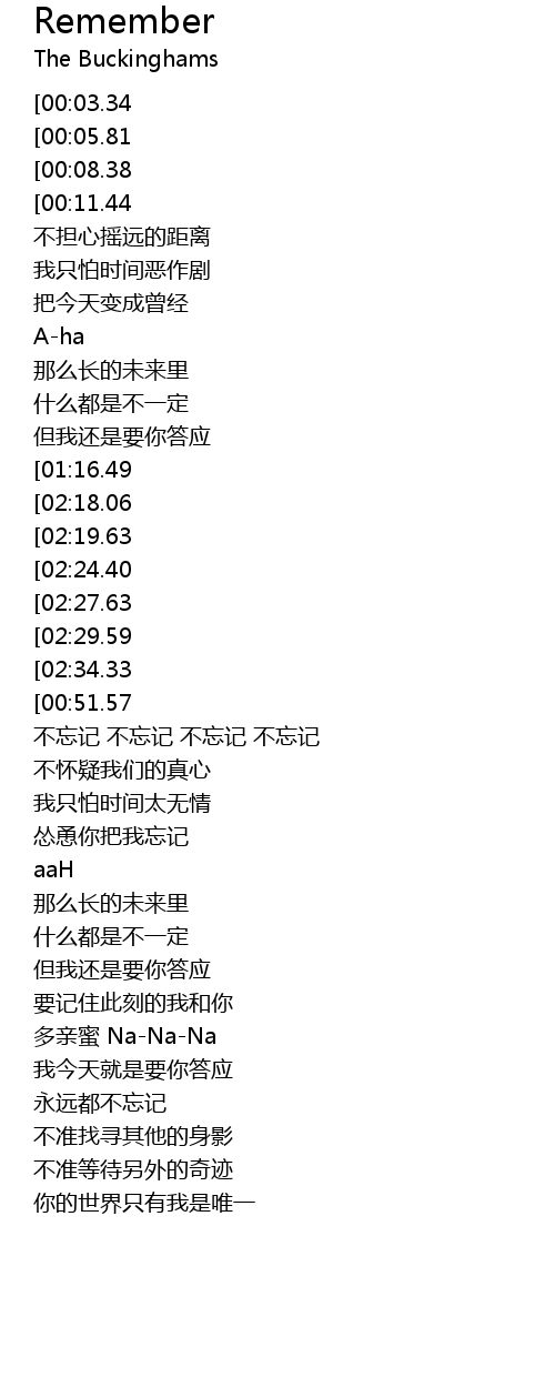 | [02:44.60][02:24.40][01:24.25][00:39.27] | 你永远不忘记 |