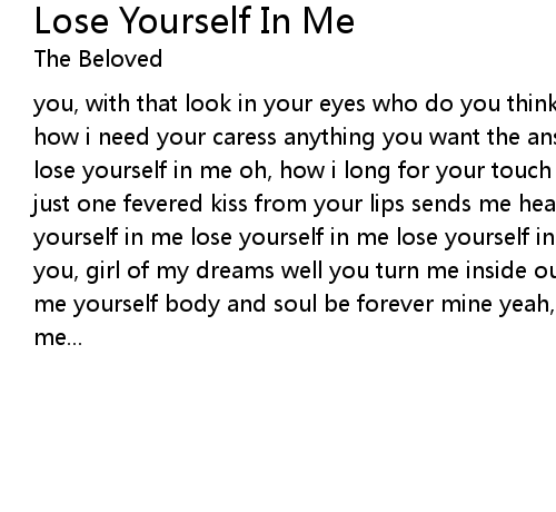 you, with that look in your eyes who do you think about as you fantasize? oh, how i need your caress anything you want the answer is yes lose yourself in me lose yourself in me oh, how i long for your touch how you tantalise me so much just one fevered kiss from your lips sends me heaven bound permanent bliss lose yourself in me lose yourself in me lose yourself in me lose yourself in me yeah you, girl of my dreams well you turn me inside out apart at the seams just give me yourself body and soul be forever mine yeah, forever mine lose yourself in me... |