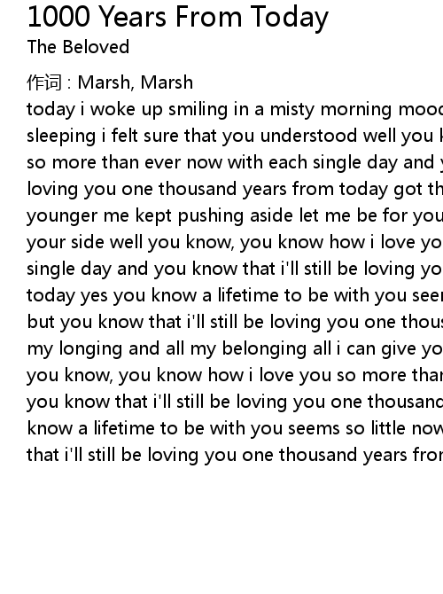 | today i woke up smiling in a misty morning mood watched your face as you were sleeping i felt sure that you understood well you know, you know how i love you so more than ever now with each single day and you know that i' ll still be loving you one thousand years from today got that deeper kind of feeling that a younger me kept pushing aside let me be for you all that i' m longing to right by your side well you know, you know how i love you so more than ever now with each single day and you know that i' ll still be loving you one thousand years from today yes you know a lifetime to be with you seems so little now yet so far away but you know that i' ll still be loving you one thousand years from today all of my longing and all my belonging all i can give you, all my life with you well you know, you know how i love you so more than ever now with each single day and you know that i' ll still be loving you one thousand years from today yes you know a lifetime to be with you seems so little now yet so far away but you know that i' ll still be loving you one thousand years from today |