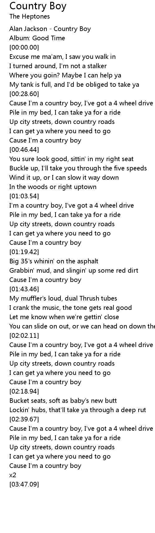Cause I'm a country boy, I've got a 4 wheel drive |