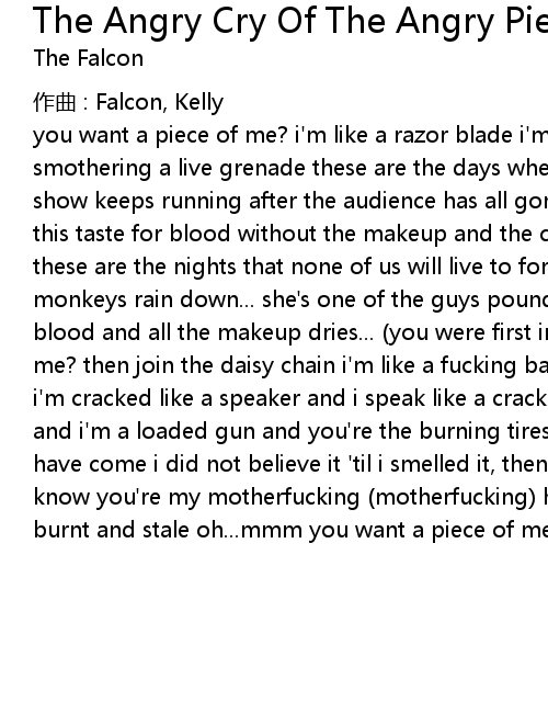 | you want a piece of me? i' m like a razor blade i' m like a pound of blubber smothering a live grenade these are the days when the tv always stays on the show keeps running after the audience has all gone home i' m like a vampire with this taste for blood without the makeup and the cape i' m just a fucking hood these are the nights that none of us will live to forget lying face down as the monkeys rain down... she' s one of the guys pounding that beat all night when the blood and all the makeup dries... you were first in line you want a piece of me? then join the daisy chain i' m like a fucking band leader for the hit parade i' m cracked like a speaker and i speak like a cracker these are the trip wires and i' m a loaded gun and you' re the burning tires the burning fires the days have come i did not believe it ' til i smelled it, then i had to see it did you know you' re my motherfucking motherfucking hero? the wind beneath my wings is burnt and stale oh... mmm you want a piece of me? well, come one! |