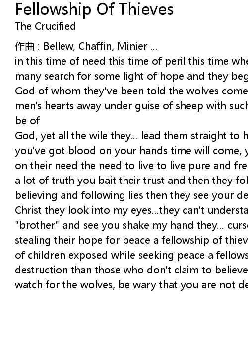 | Christ they look into my eyes... they can' t understand when they hear you call me " brother" and see you shake my hand they... curse his name ' cause of you... stealing their hope for peace a fellowship of thieves hands dipped in the blood of children exposed while seeking peace a fellowship of thieves causing more destruction than those who don' t claim to believe this fellowship of thieves watch for the wolves, be wary that you are not deceived |