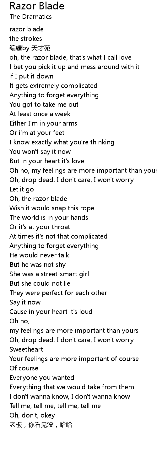 | [00:25.44] | oh, the razor blade, that's what I call love |