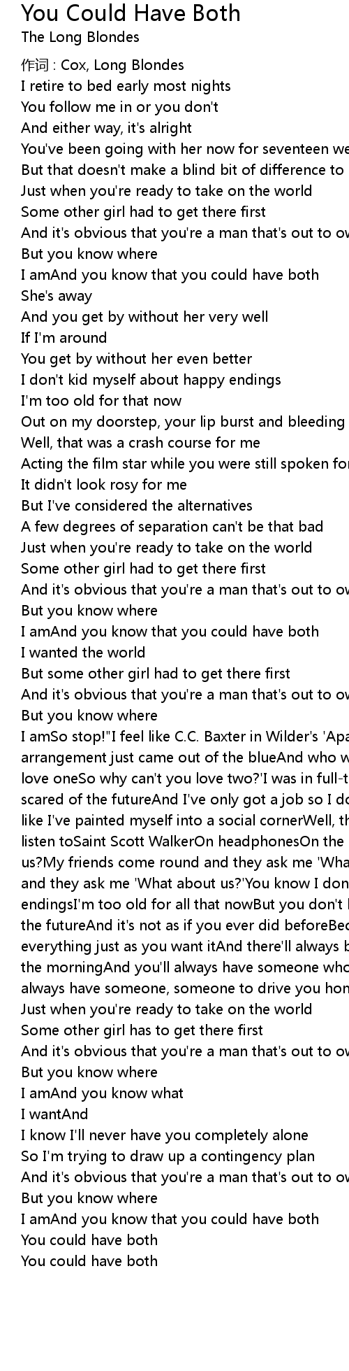 | I amSo stop!" I feel like C. C. Baxter in Wilder' s ' Apartment', That particular arrangement just came out of the blueAnd who was it who sang ' I know that you love oneSo why can' t you love two?' I was in fulltime education when I got scared of the futureAnd I' ve only got a job so I don' t disappoint my motherIt' s like I' ve painted myself into a social cornerWell, that' s what happens when you listen toSaint Scott WalkerOn headphonesOn the bus. What about us? What about us? My friends come round and they ask me ' What about us?' My friends come round and they ask me ' What about us?' You know I don' t kid myself about happy endingsI' m too old for all that nowBut you don' t have to worry that much about the futureAnd it' s not as if you ever did beforeBecause you' ll always have everything just as you want itAnd there' ll always be a phone to ring at three in the morningAnd you' ll always have someone who' ll drive you homeYes, you' ll always have someone, someone to drive you home. Someone to drive you home." | |