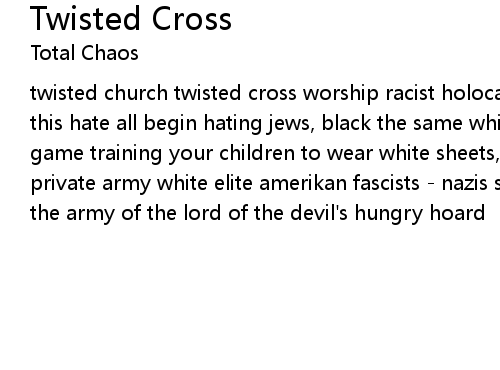 | twisted church twisted cross worship racist holocaust c.s.a., a.a.n., where did this hate all begin hating jews, black the same white supremacy, that's your game training your children to wear white sheets, your amerika is not for me private army white elite amerikan fascists - nazis stink the covenant, the sword the army of the lord of the devil's hungry hoard |