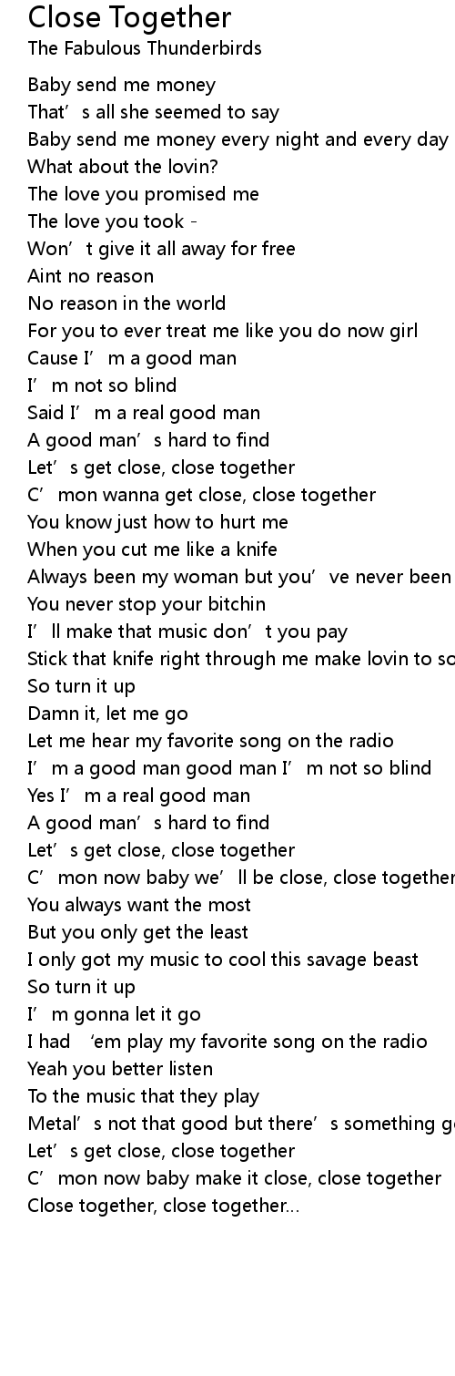 | C' mon now baby we' ll be close, close together | |