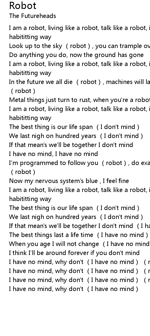 | [00:39.89] | I am a robot, living like a robot, talk like a robot, in the habititting way |